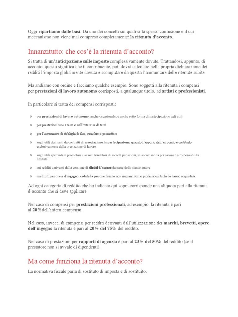 La ritenuta d acconto irpef è solitamente pari al 20. Se non appartieni al regime forfettario che non prevede la ritenuta d acconto nel documento di pagamento per il tuo cliente dovrai inserire la ritenuta d acconto. E devi emettere fattura. Ritenute d acconto le prestazioni occasionali nel momento in cui vengono svolte per conto di un soggetto titolare di partita iva associazioni società cooperative ditte individuali professionisti etc al prestatore di lavoro deve essere applicata una ritenuta di acconto.