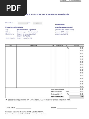 Aggiornamenti ti sarà capitato di trovarti in una situazione di dover svolgere un determinato lavoro oppure viceversa di aver bisogno di una persona che sporadicamente lavori per te. Tutti i dettagli della ricevuta i fac simili da scaricare e il modello prestampato da compilare disponibile di seguito. La ricevuta per prestazione occasionale ha carattere di quietanza di pagamento quindi la sua emissione certifica l avvenuto pagamento della prestazione. Ad oggi questo rappresenta una guida aggiornata e completa sulla ricevuta per prestazione.